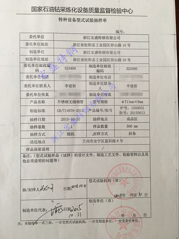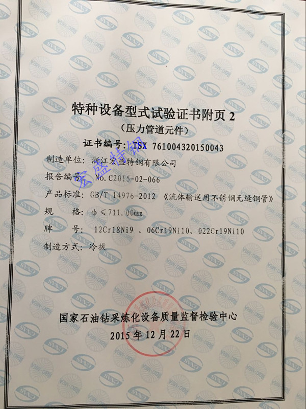 2015年12月22日,公司生產(chǎn)的規(guī)格為:711mm×9mm大口徑薄壁不銹鋼無(wú)縫鋼管,通過國(guó)家石油鉆采煉化設(shè)備質(zhì)量監(jiān)督檢驗(yàn)中心特種設(shè)備型式試驗(yàn)。